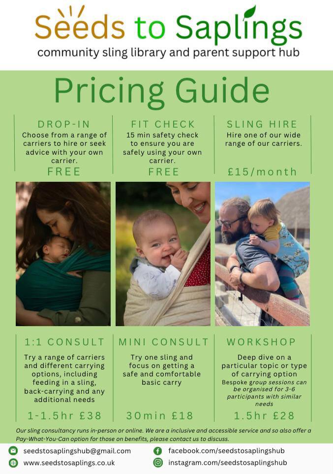 Our sling library drop-in sessions are free, they run twice a month for anyone who wants to pop by and we are happy to offer our time, advice and support in any way we can.